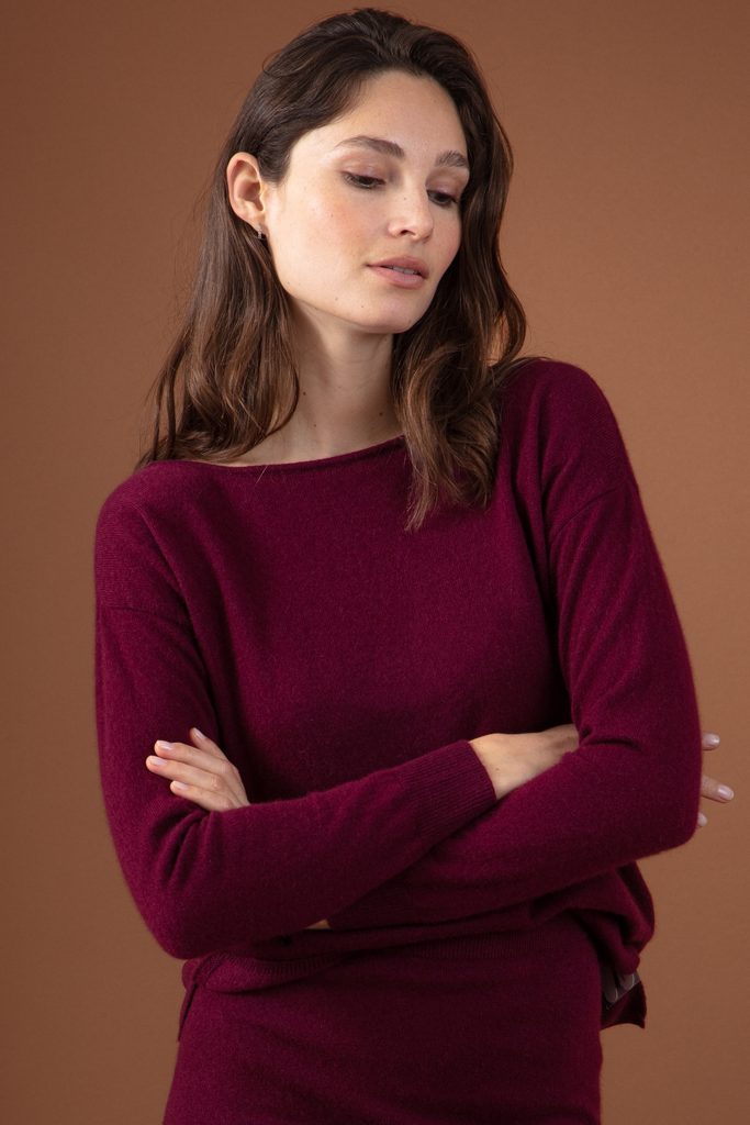 Original and feminine, the ROWENA jumper stands out with its reversible design: one side features a V-neck with a detail tie design, the other a simple and elegant boat neckline.