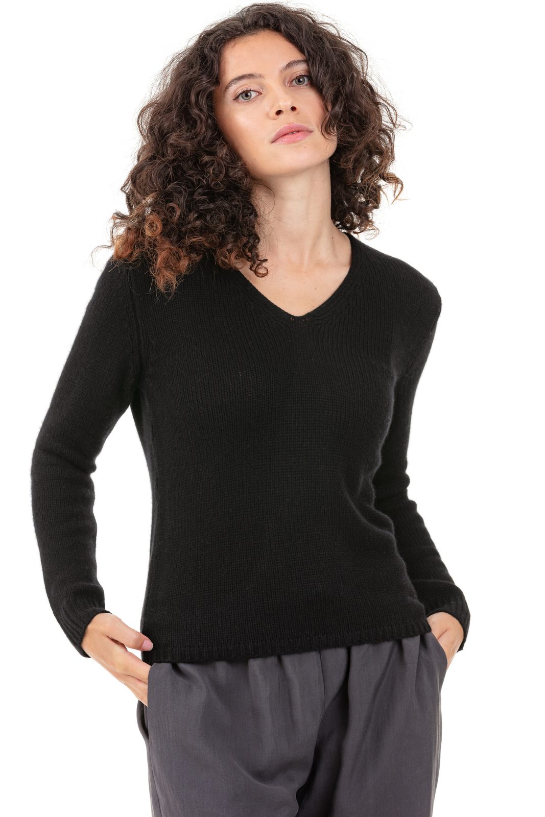• Fit: straight • Composition: 100% cashmere • Thickness: 6-ply (loose-gauge) • Details: V-neck