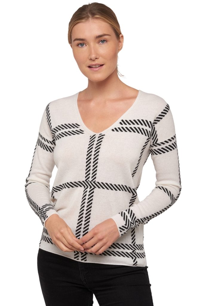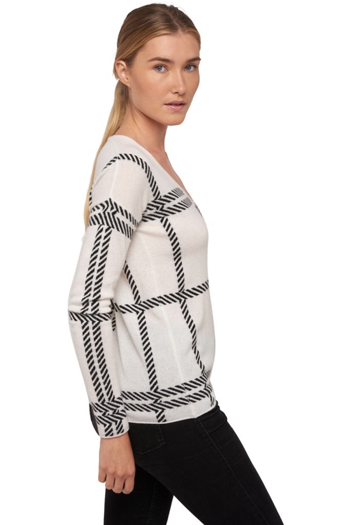 Dvojfarebný sveter s výstrihom do V a veľkým károvaným vzorom.